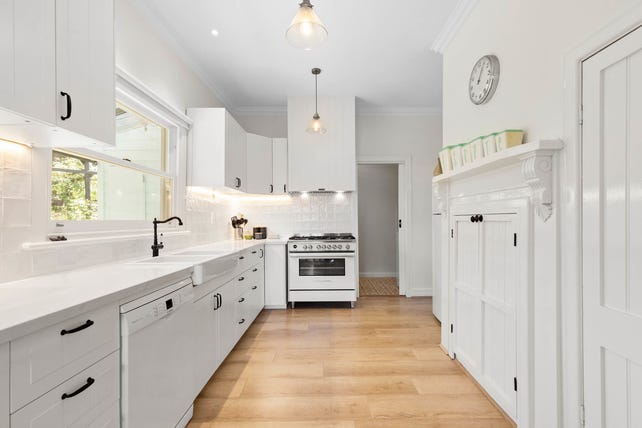 At its heart, a gorgeous kitchen has been beautifully updated in sympathy with its inherent timeless appeal, boasting stone surfaces, farmhouse sinks, soft-close drawers, brilliant pantry storage, a Bosch dishwasher, and a 900mm-wide oven/5-zone cooktop.