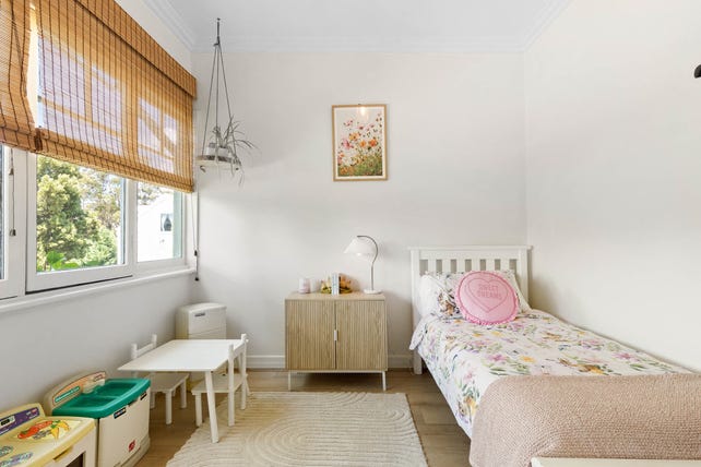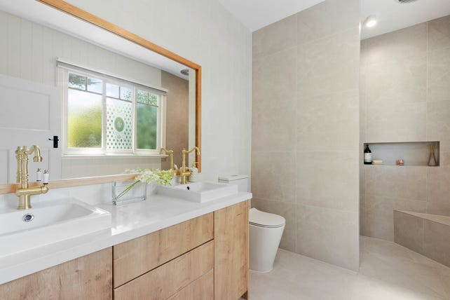 Accommodation consists of three bedrooms, with the master bedroom showcasing expansive windows with mountain views, a walk-in robe, and a tastefully updated ensuite featuring classic tapware, a twin stone vanity, 60cm large-format tiles, a walk-in niched shower, and heated towel rail. Thoughtfully updated, the central bathroom matches the same luxurious theme, and includes a stone vanity, a frameless glass shower-over-bath, and Mediterranean-style floor tiles. The home also includes air-conditioning and ceiling fans.