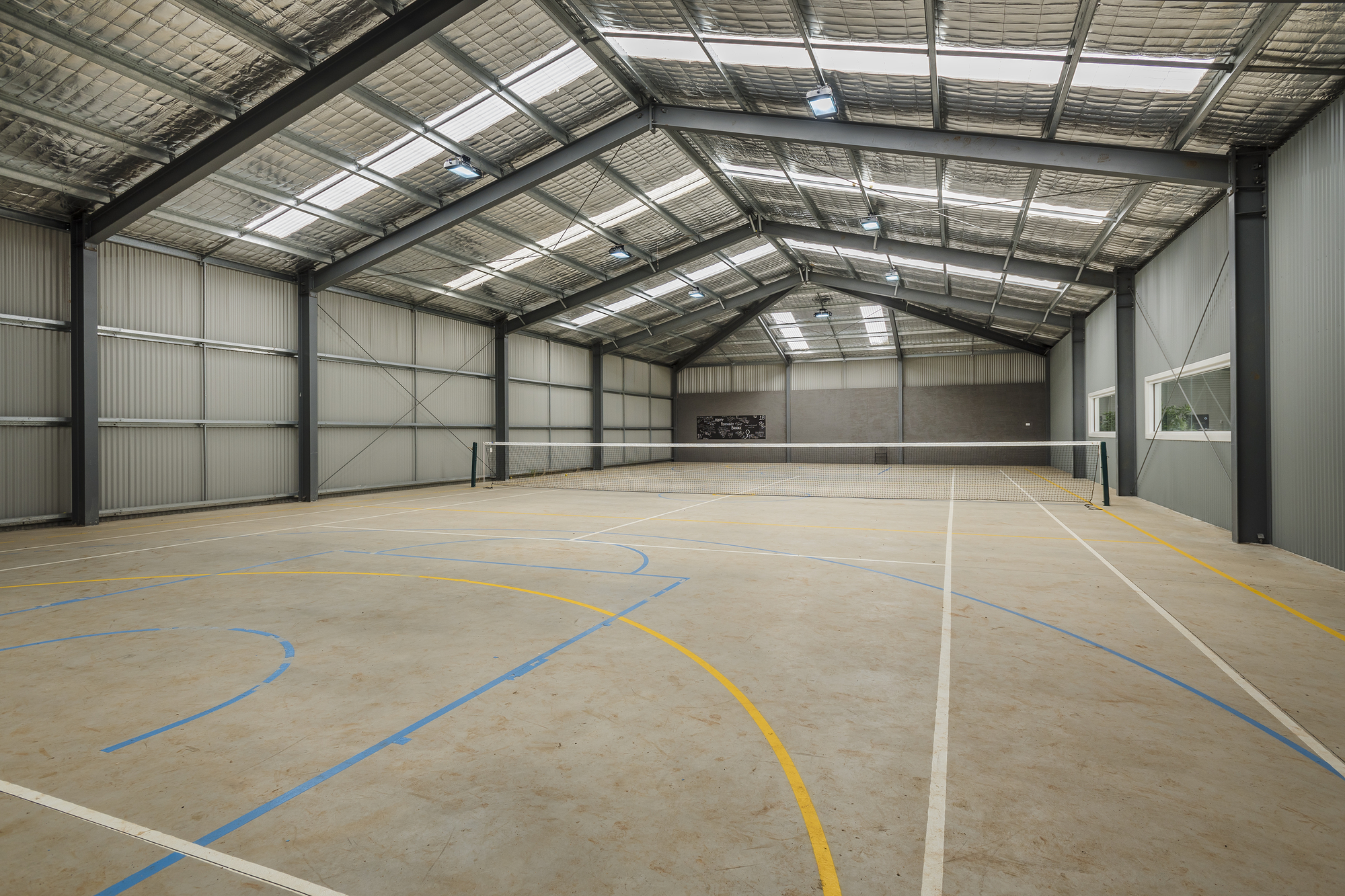 with open fireplace and billiard table • Fully equipped gym by the pool • Full size indoor tennis/basketball court