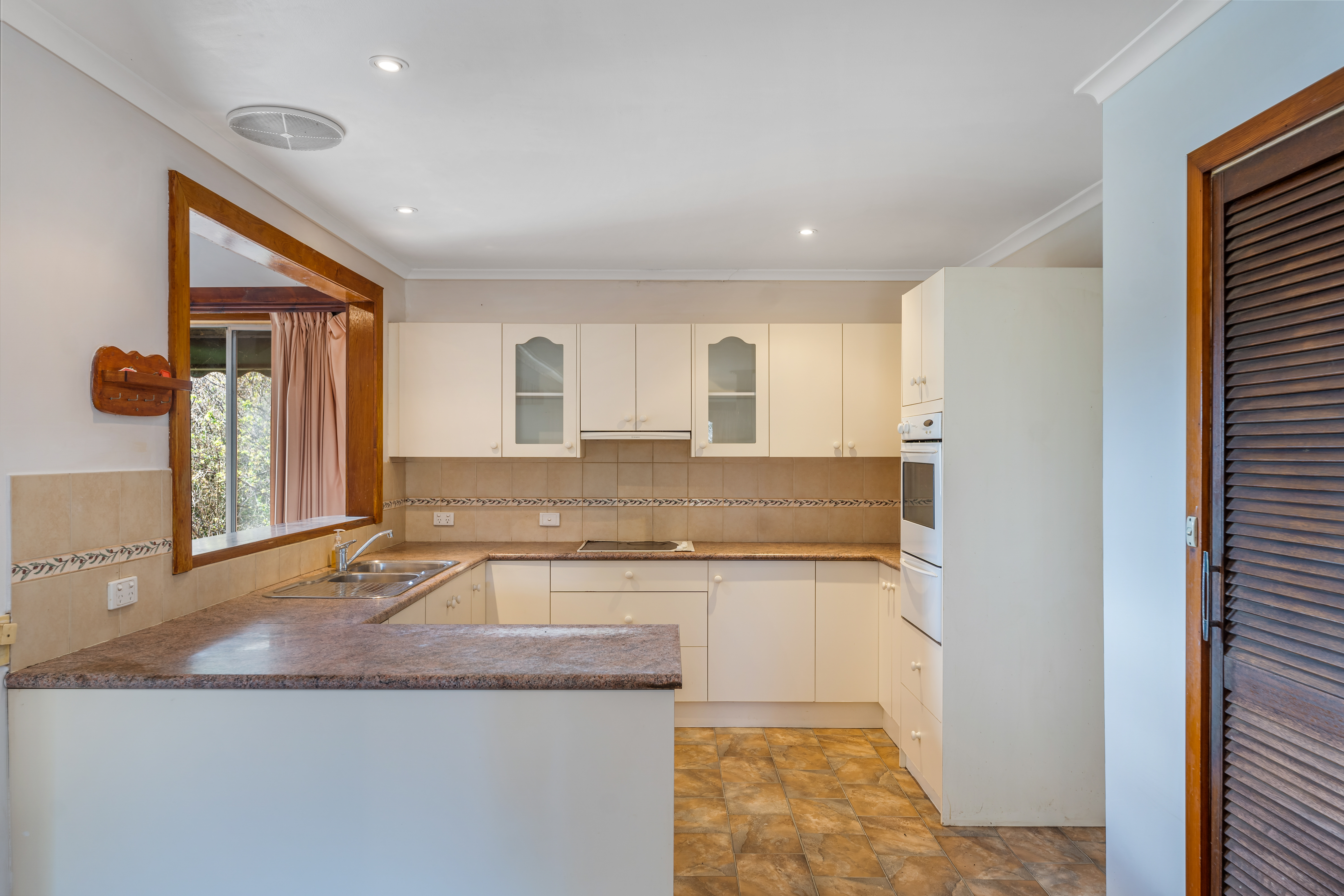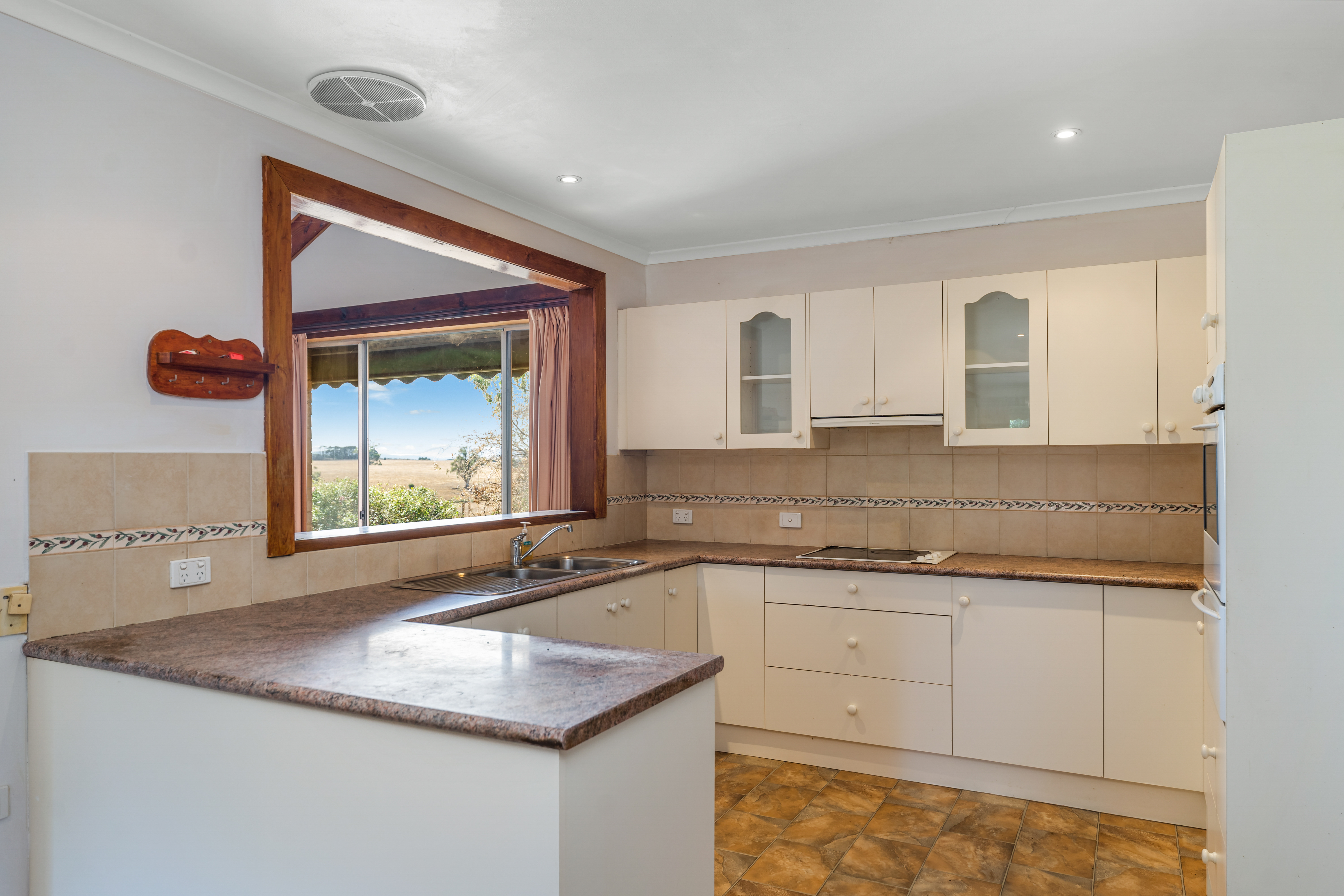 The kitchen is very neat with ample bench space and all warmed with the solid fuel heater.