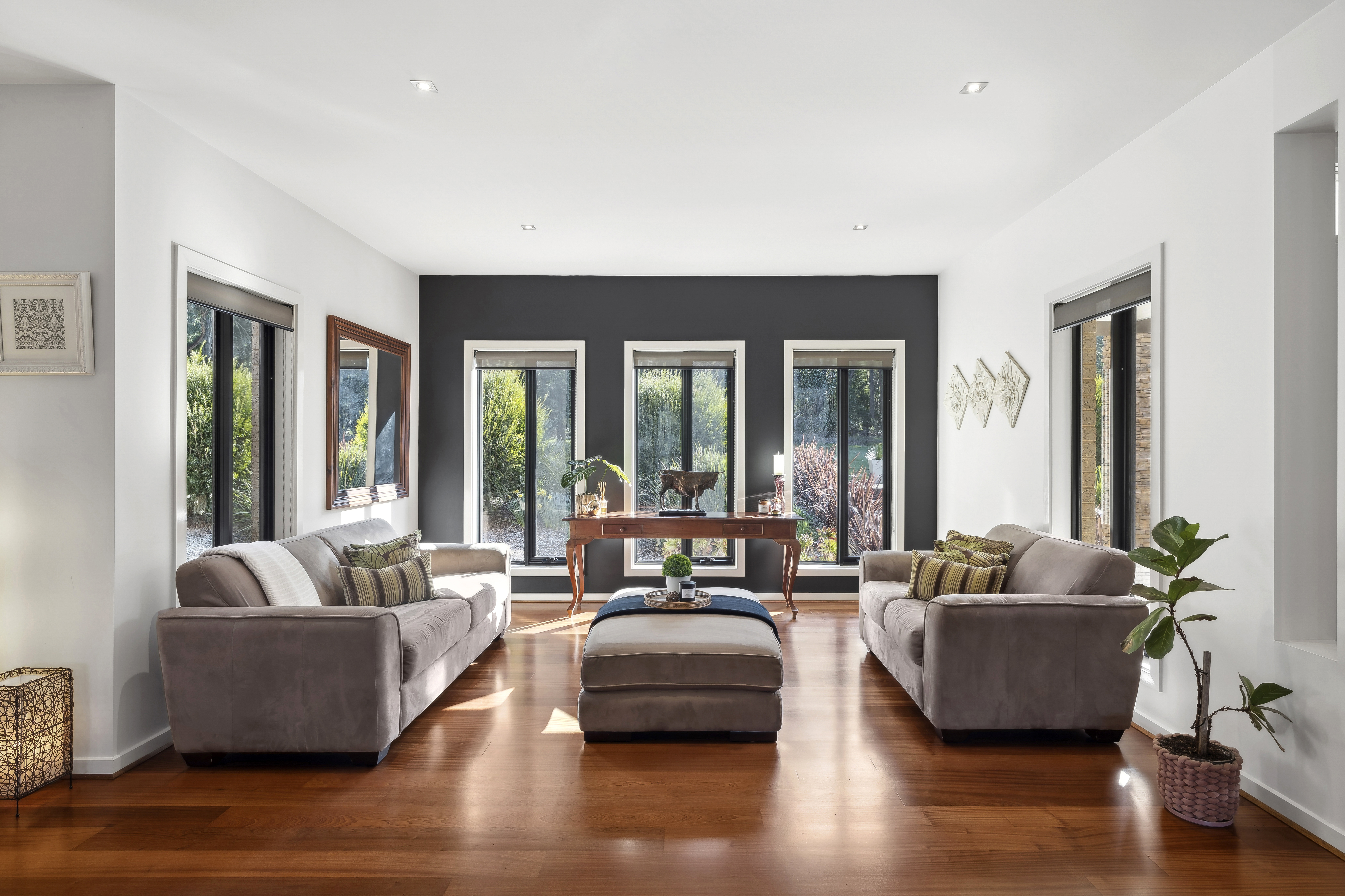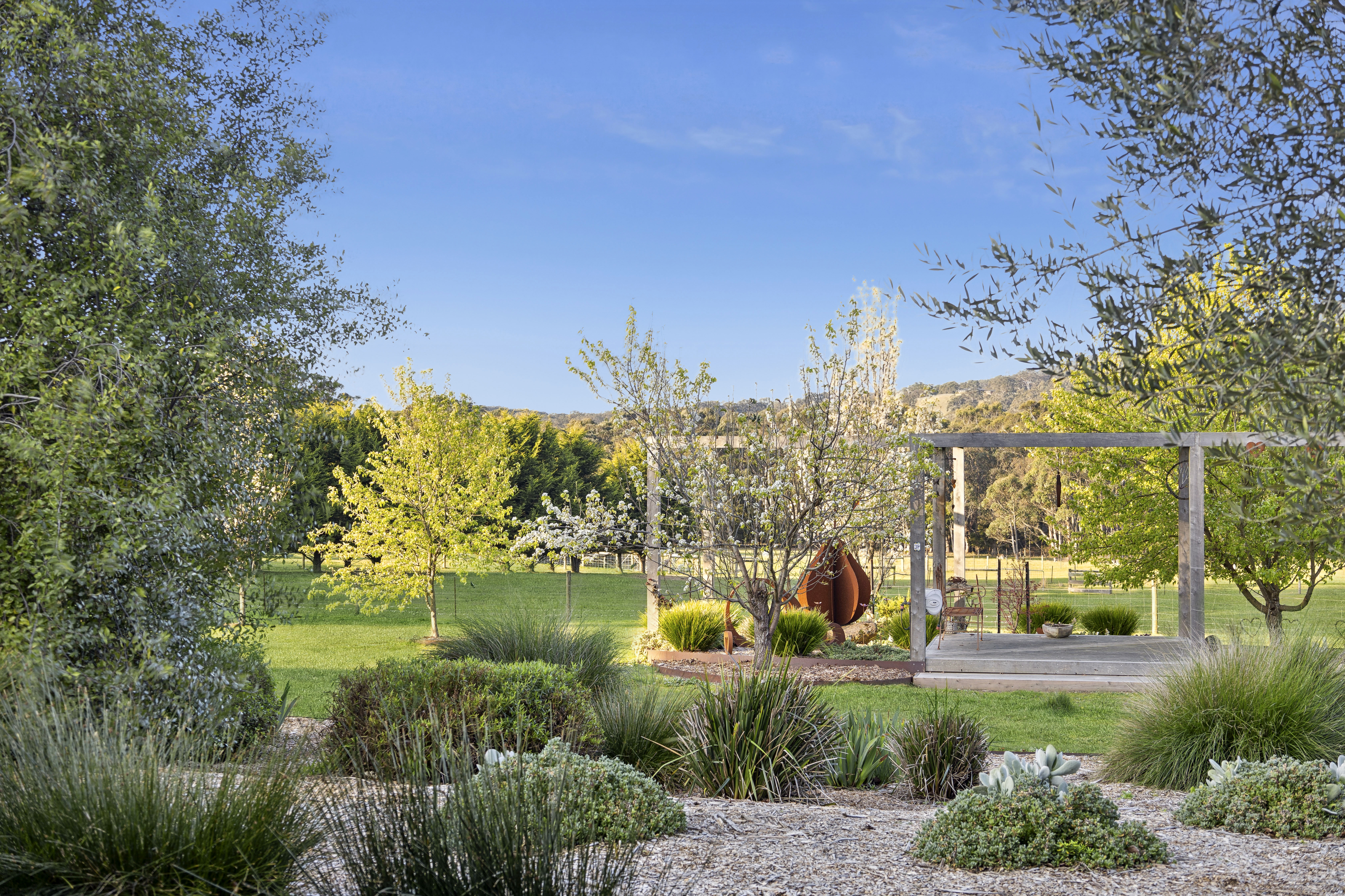 As you approach the automatic gates, the sweeping driveway hints at the thoughtful layout focused on the significant views of the picturesque Mount Macedon. The property features meticulously manicured park-like gardens, lush lawns, and mature trees that provide a serene, private sanctuary away from the road.