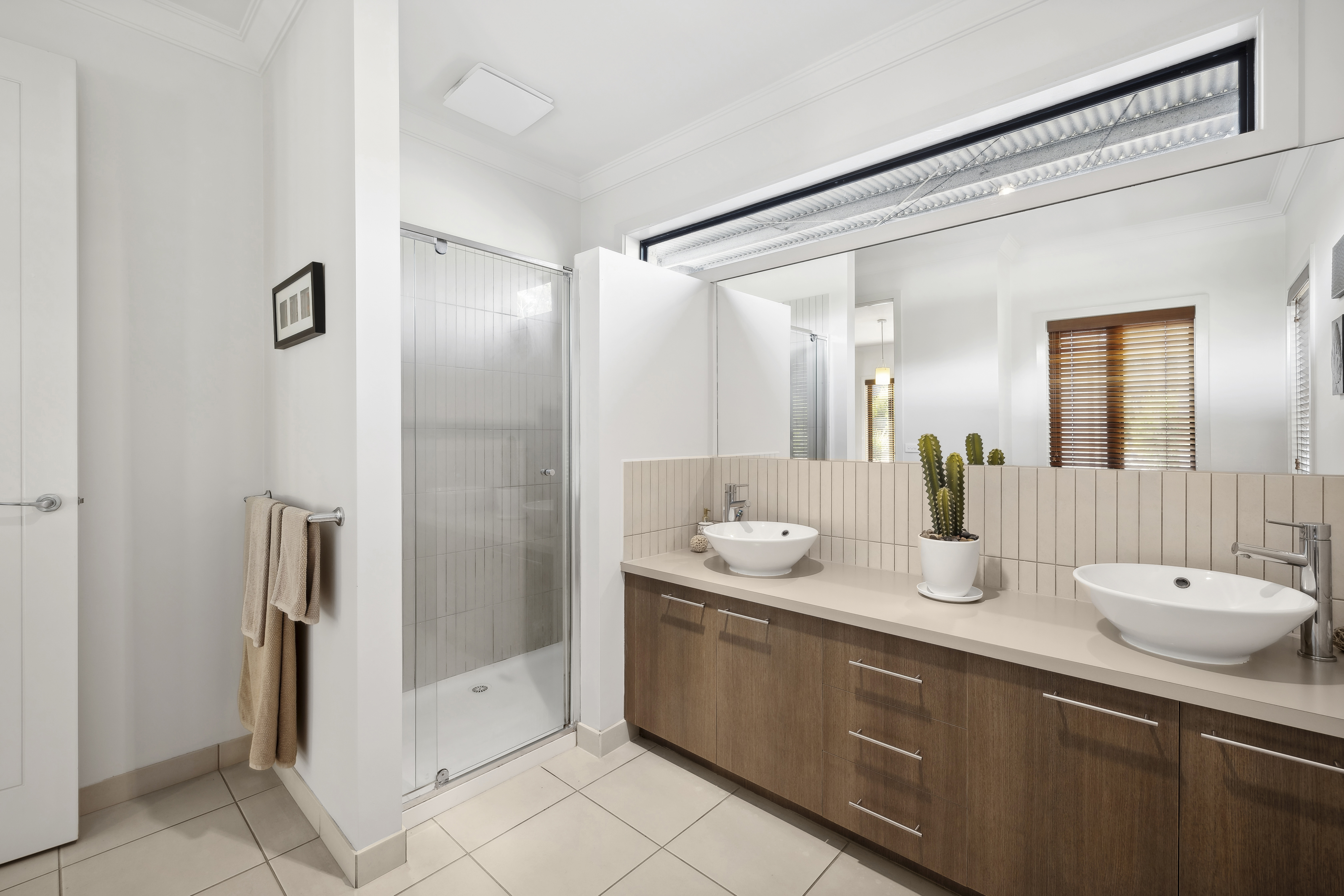 The heart of the home is the open plan living and dining area, where high ceilings and abundant natural light create a lovely living space. This space is divided into three distinct zones whilst retaining a very open feel: a formal living room, a cozy lounge and tv space, and a spacious dining area. The expansive kitchen is a cook's dream, featuring a large island bench, equipped with stone benchtops and a generous walk-in pantry, ensuring ample space for hosting family gatherings and events. The kitchen opens directly to the outdoor entertaining area and magnesium pool, making for a seamless indoor-outdoor living experience.