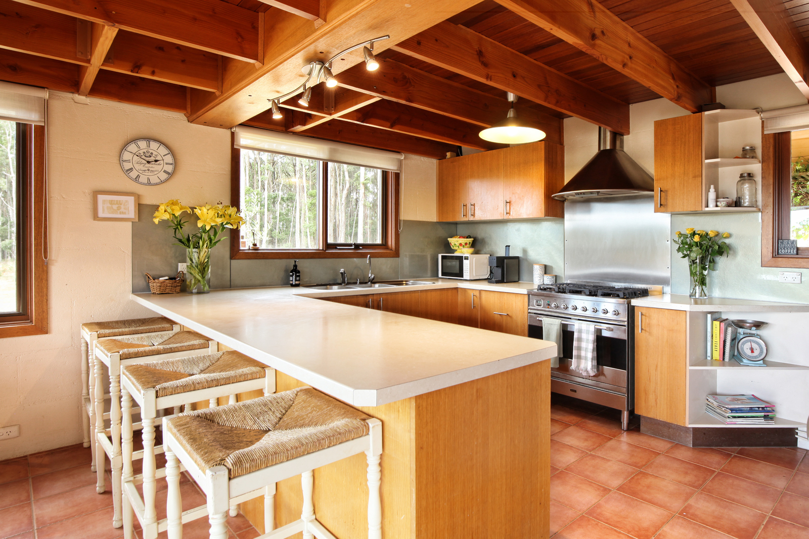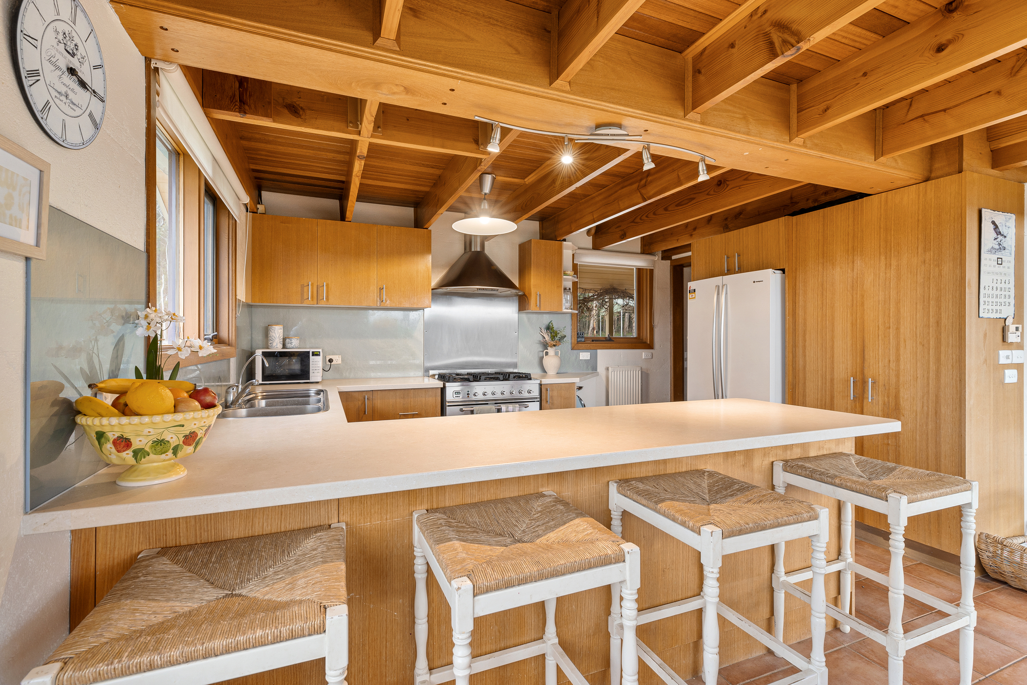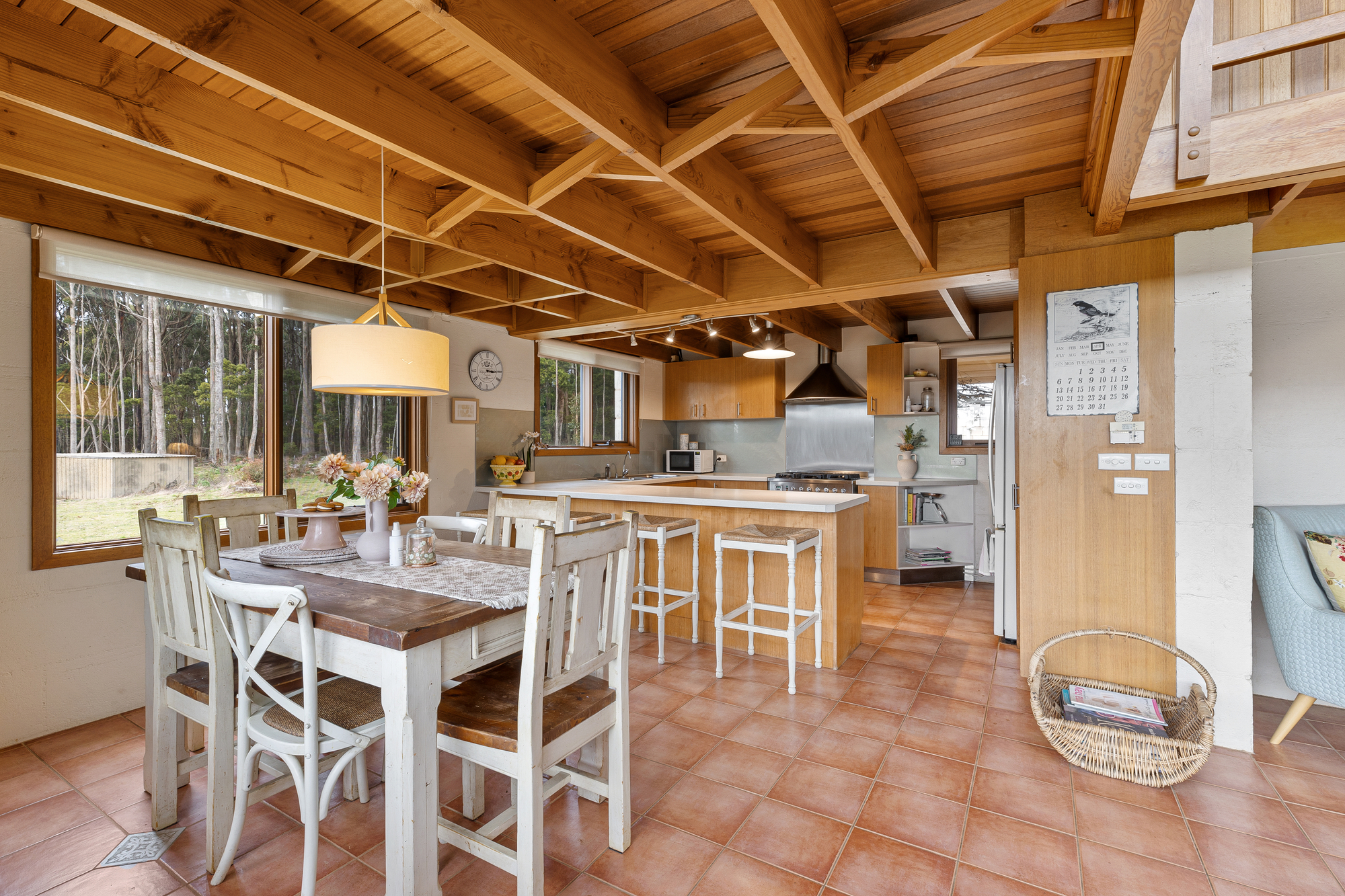 Inside, there are four spacious bedrooms, three bathrooms (two ensuites) and numerous living zones. Both formal and informal living are cleverly linked by an inviting dining area which connects the two. The lounge is stunning and has a French fireplace insert with granite surround and French doors to a paved outdoor sitting area. Timber lined ceilings, cedar windows and doors and double glazing provide warmth and charm to create a cosy atmosphere perfect for entertaining or quiet relaxation. The kitchen, featuring a 900mm Ilve oven is perfect for family meals and gatherings, a welcoming space that includes a meals and sitting area to the east which is bathed in natural morning and afternoon light. The laundry/mudroom has a separate w.c.