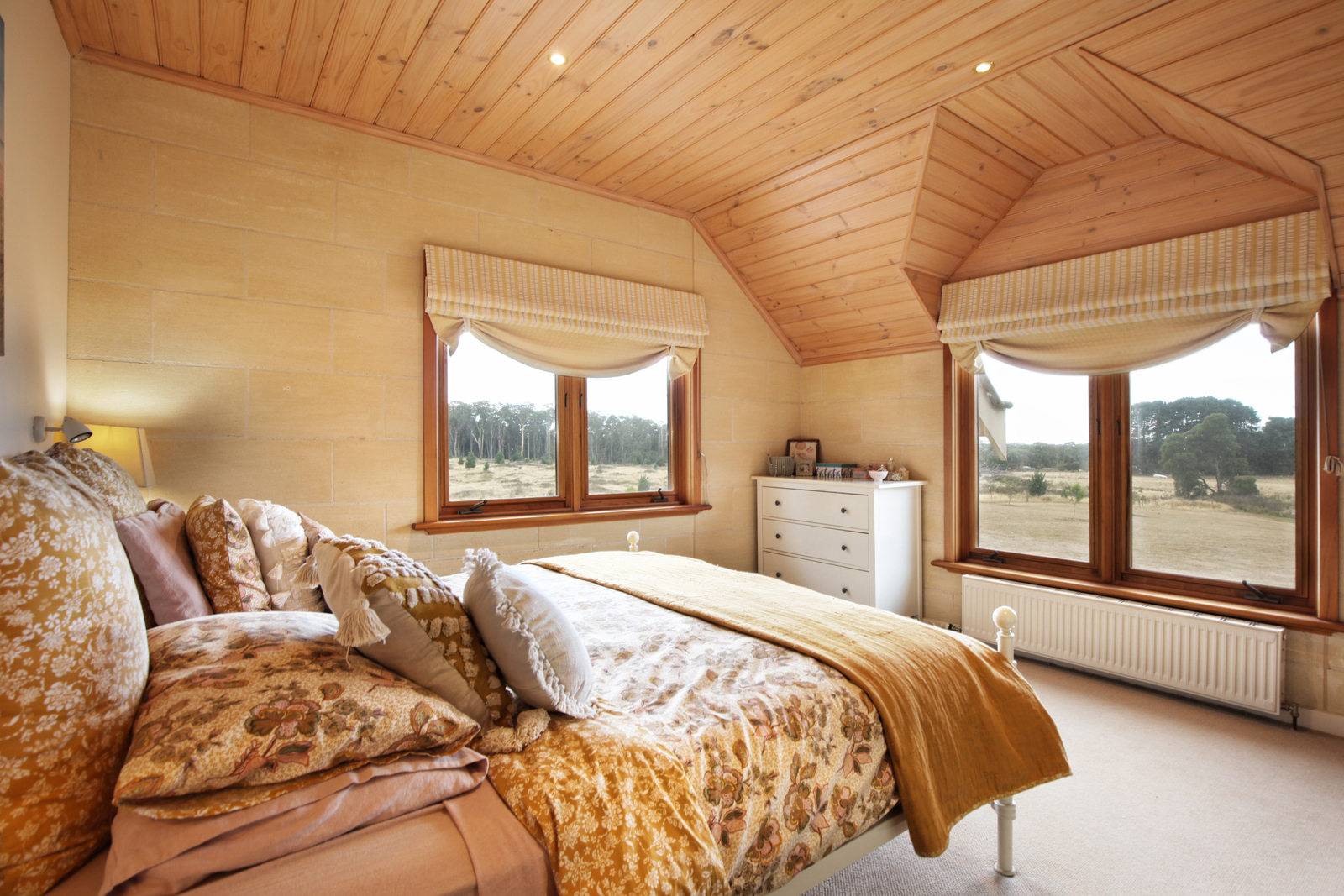 Maison – A Private Country Escape Nestled on 16.19ha (40 acres) in the picturesque Macedon Ranges this architect designed farmhouse offers privacy and serene rural views. The only sounds you'll hear are the calls of local birdlife. The design brings an abundance of natural warmth and light into every room along with a versatile floor plan that seamlessly connects indoor and outdoor living. Crafted from natural Mt Gambier stone and timber, the house has a thermal quality providing warmth in winter and cool in the summer and exudes an earthy charm and a strong connection to nature.